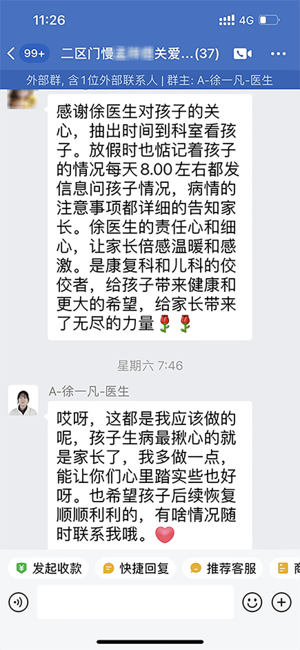 感谢徐医生对孩子的关心,抽出时间到科室看孩子。放假时也惦记着孩子的情况每天8:00左右都发信息问孩子情况,病情的注意事项都详细的告知家长。徐医生的责任心和细心,让家长倍感温暖和感激。是康复科和儿科的佼佼者,给孩子带来健康和更大的希望,给家长带来了无尽的力量。