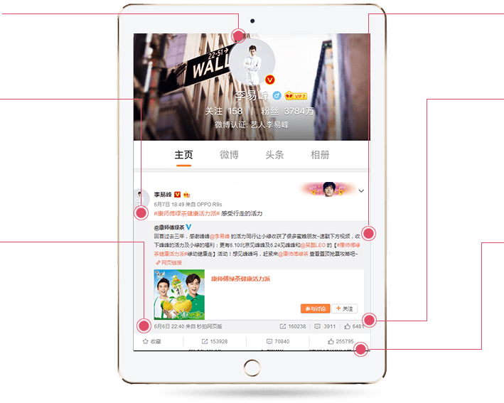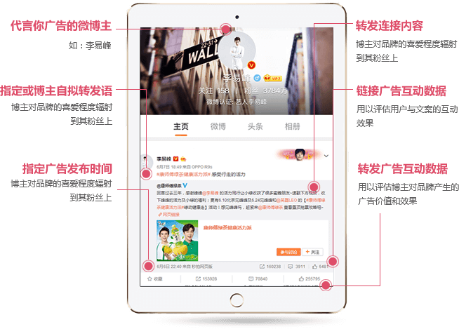 大数据系统精准人群定向技术,筛选出真正能强化目标品牌个性的微博红人,为广告主“代言”,发布微博“软”广告,以图文形式推送广告内容。